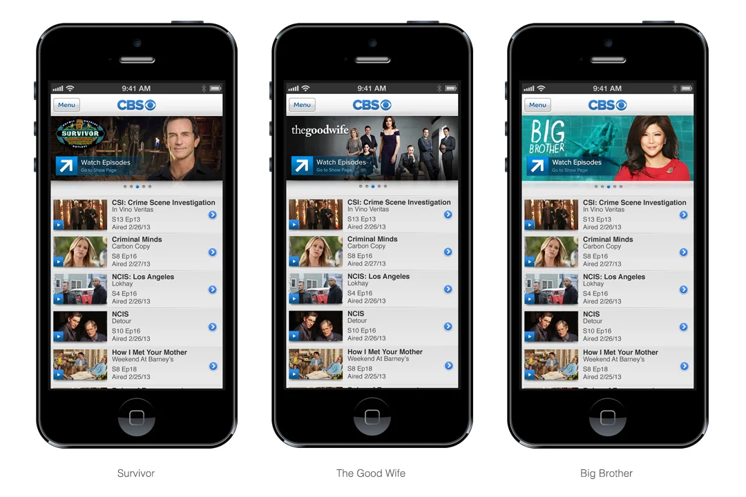 Mobile and tablet design for the official CBS mobile app. Style guide creation, text and button styling, and key art editing for over 100 of CBS's most popular daytime and primetime programs. Also shown are concept mocks for a How I Met Your Mother™ tablet app, created for CBS Interactive. Streamlined, touch-friendly UI design encourages users to connect on various social platforms while a rotating carousel and swipeable side-nav system allow easy access to all functions of the interactive app.